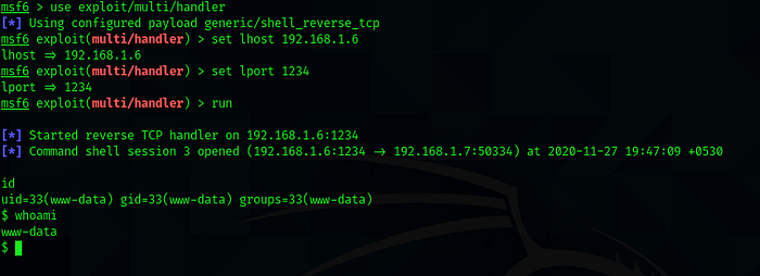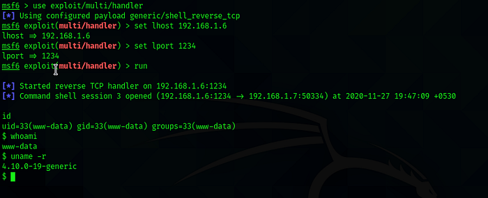 For capturing the reverse shell I fired up my metasploit multi handler module to get the reverse shell