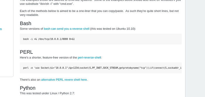 Our next step would be to get interactive shell using, the reverse shell one liner. I will be using cheatsheet from here https://pentestmonkey.net/cheat-sheet/shells/reverse-shell-cheat-sheet