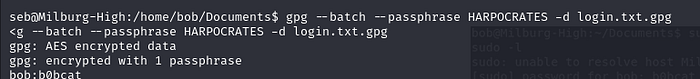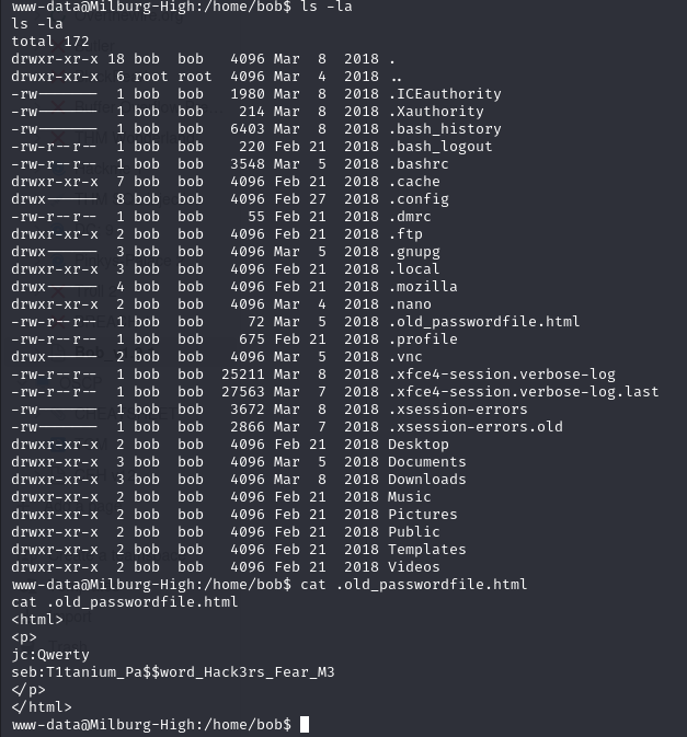Under the bob’s home directory we can see .old_passwordfile.html wich contains credentails of jc and seb
