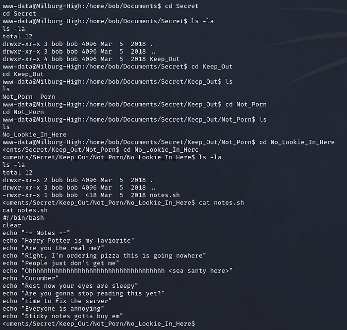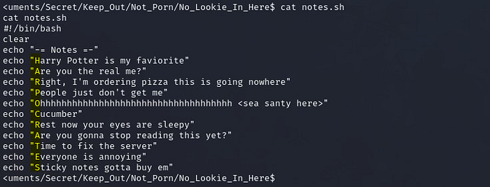 Deep inside the Secret folder we have notes.sh , Reading the content of notes.sh at first didn’t make much sense.