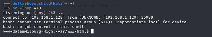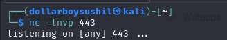 Make netcat listner ready, use the same port you used before, 443 in my case.