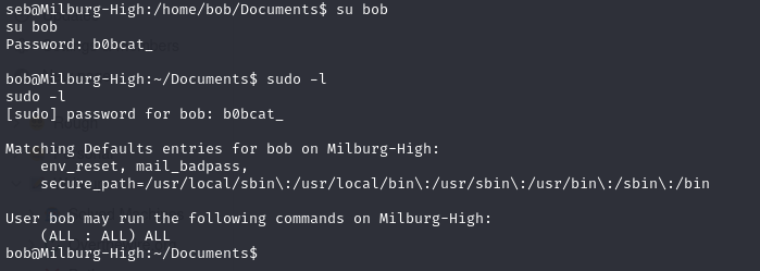 Then switching user to bob and using command sudo -l reveals we can use run all command as sudo.