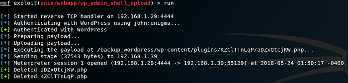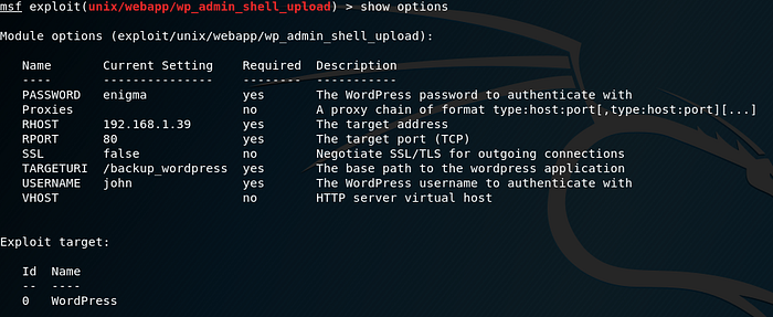 use exploit/unix/webapp/wp_admin_shell_uploadThen set my options