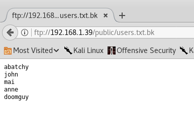 Inside the public directory we find a back up of a text file called users.txt.bk
