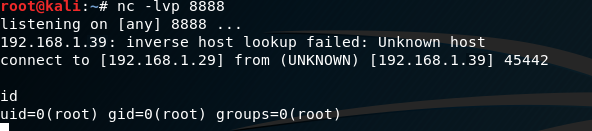 nc -lvp 8888After a brief moment, I receive the reverse root shell as expected: