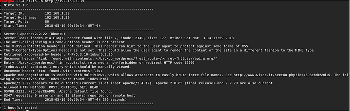 So here was the Nikto command and scan results: