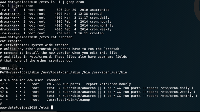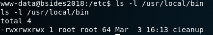 So root has this cleanup script that runs basically every second based on numerous leading asteriks which denotes when it should run. The cleanup script has world read,write, execute permissions (777):