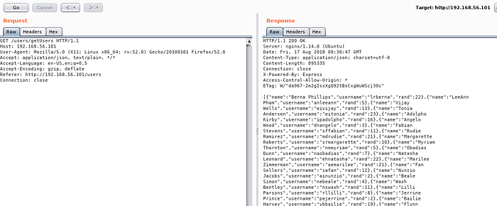 Nikto and dirb results were not satisfactory and I decided to browse around the site. Bulldog.social wasn't accepting registrations but there was a considerable number of users already in the application. I was logging the HTTP traffic in burpsuite proxy while I was browsing the application. In the proxy logs, I spotted an interesting API call to /users/getUsers?limit=9. I removed the limit parameter and there were 15000+ users!