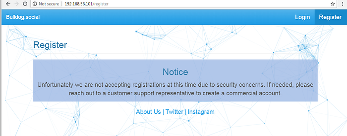 The main application was a nicely designed social media website powered by AngularJS (check the favicon of the application). Angular is named as the super heroic MVC platform by its makers and is a quite impressive platform in terms of security the platform provides.