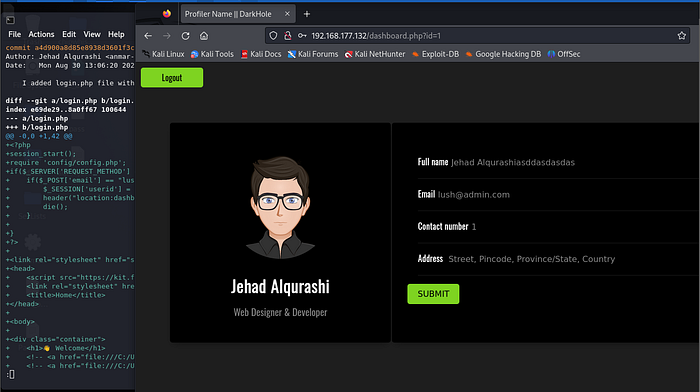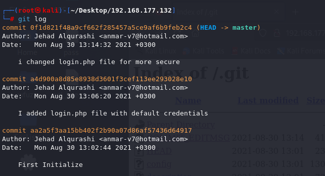 Unfortunately, this login page didn’t suffer from SQL injection commands we tried (most probably there was input sanitization) and the source code did not yield any clues. So, we went back to the ‘.git’ repository we found earlier during the nmap scan.