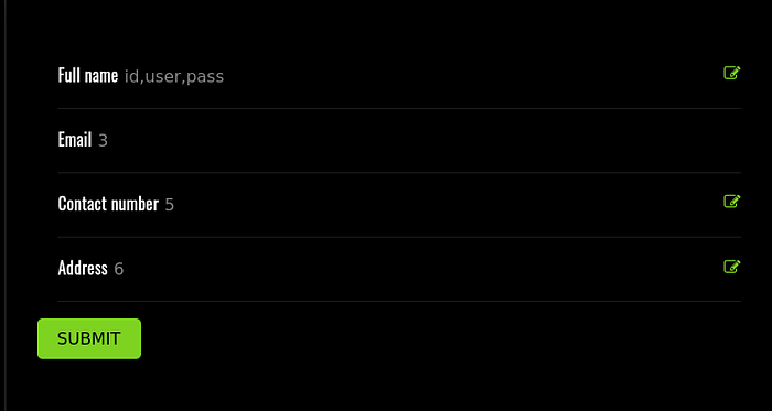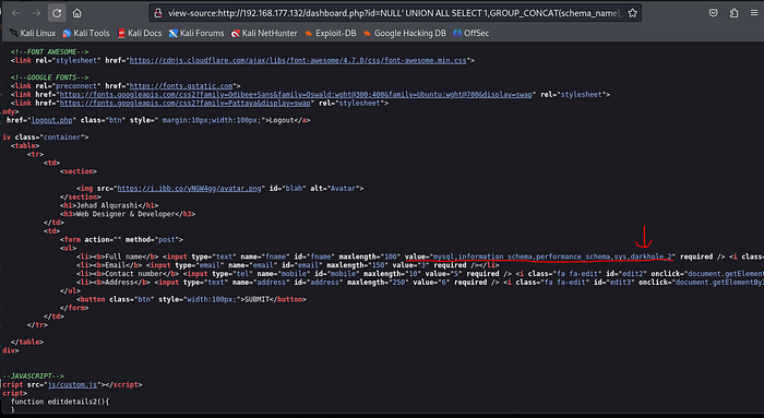 We noticed columns 2, 3, 5, and 6 are reflected in the user interface, indicating that these columns could be further used to dump data. Previously, we had identified the database name as ‘darkhole_2’ from the ‘config.php’ file. But you could also find this database name out by entering the following sql command: