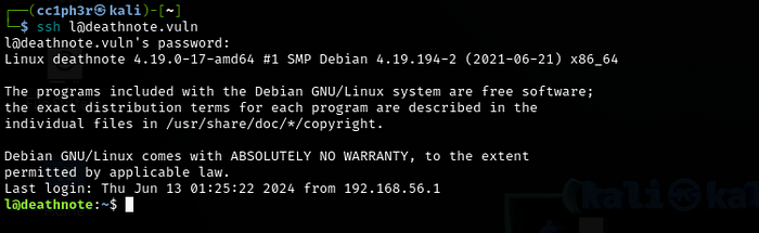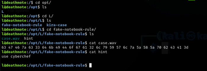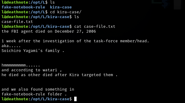 I enumerated the base directories and in the /opt folder there’s a folder named L. Two interesting files fake-notebook-rule and kira-case