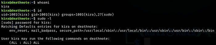Looking at Kira’s permissions, I noticed Kira can run sudo with root privileges.
