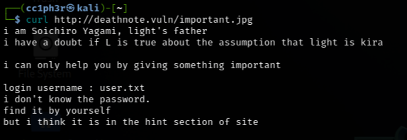 Light’s father hints that the login username will be found in the user.txt file.