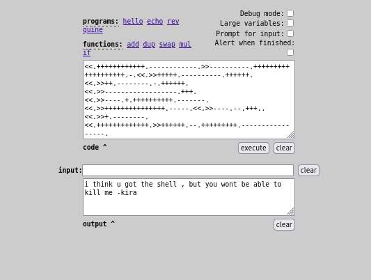 We are in, logged in as the user L. Right out of the gate there’s a user.txt file in L’s directory. It’s a coded message, the language used is brainfuck an esoteric programming language.
