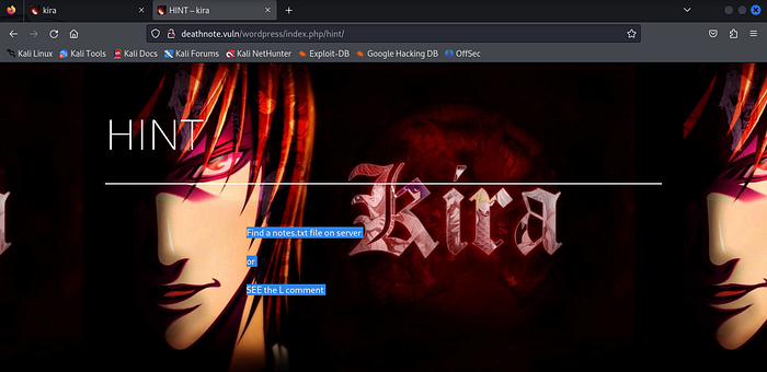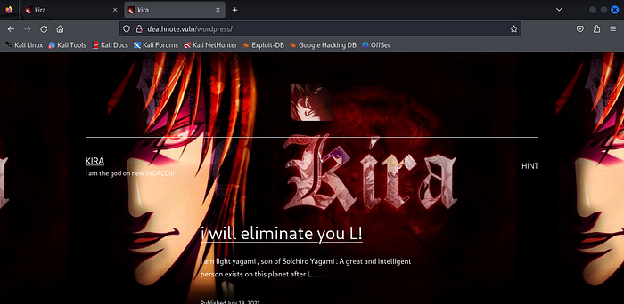Back to the webpage and after reloading it now works and renders the contents smoothly. The page looks like Kira’s page. There’s a hint at the top right of the page.