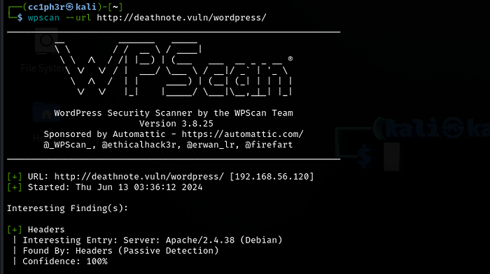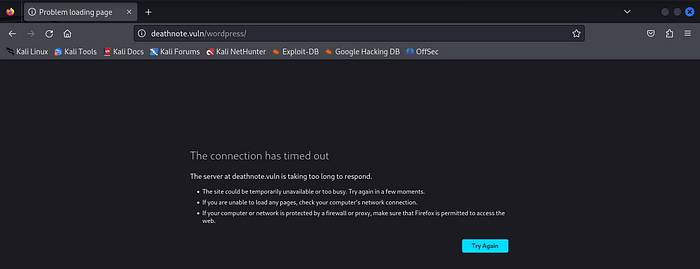 Heading over to the port 80 webpage. A deathnote.vuln page that’s running on WordPress. The page either doesn't work or hasn’t rendered properly, yet the machine is up.