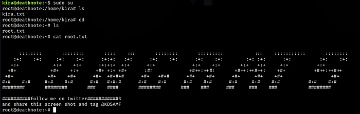 Start the login shell as root using the command sudo -i. Finally, we are root. There’s a message in root.txt.