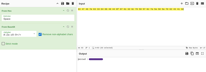 Head over to cyberchef to decode the message and we get another credential, a password.