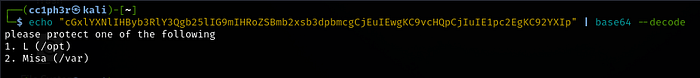 Using the credentials found a while ago login as kira. Now we can view the kira.txt file with an encoded message most likely in base64