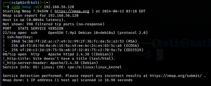 I scanned the IP looking for any open ports, in the command I ran the default script(C) and version detection(V).