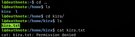 Back to the home directory, there are two users l and kira. In the kira directory, a kira.txt file looks like it’s only visible to kira.