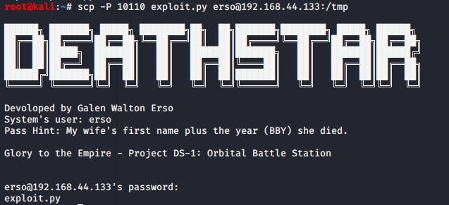 scp -P 10110 -q erso@192.168.44.133:/bin/dartVader /root