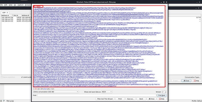 I opened this pcap file in wireshark,clicked on Conversations tab followed the UDP stream, selected only the response from the stream and saved the ASCII data to file. The format of the data seemed to be base64.