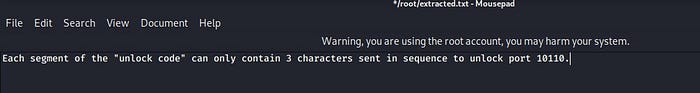 After this hint i sent the code split in groups of three to any of the ports previously used as well as the mentioned port 10110 but didn’t get a response and the port 10110 remained in filtered state. Upon googling i found a software called port knocking, where you have to “knock” on a sequence of ports in order to unlock a port in the firewall. Si I split the unlock code in groups of three the sequence of ports to knock on would be 197 ,719, 801 and 983. Then going forward where i found the port to be opened.