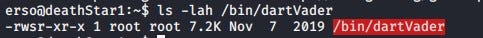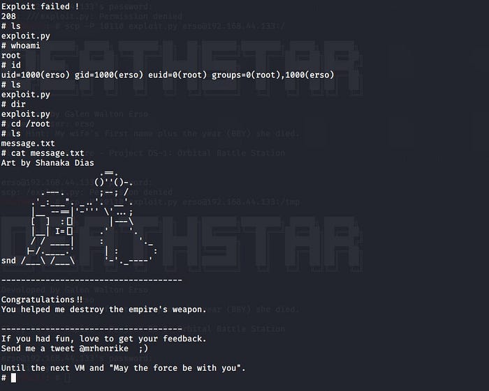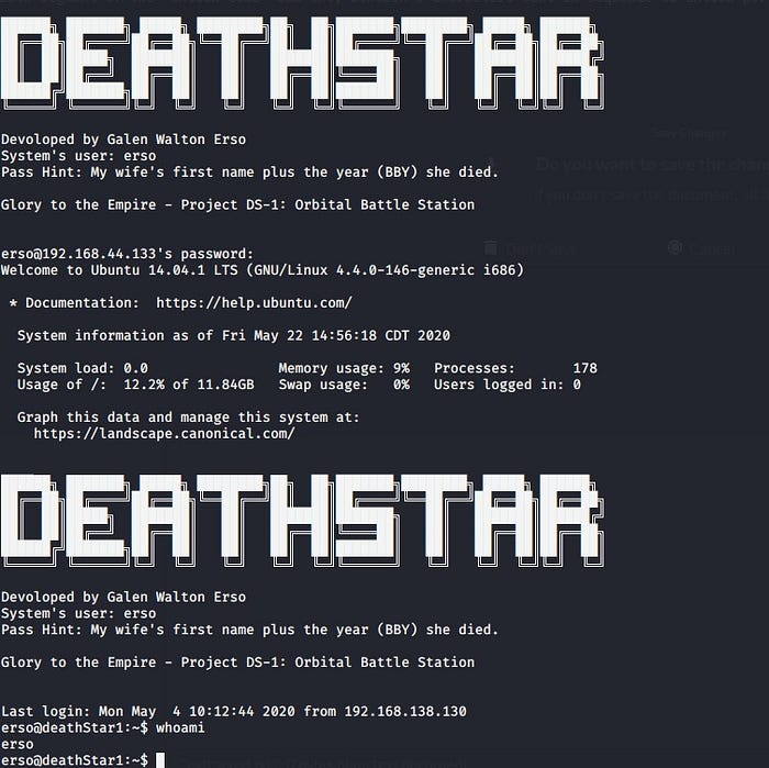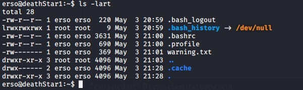 So we go further trying to ssh. But as the access we find is for a normal user named erso. We have to disconnect and try that. Here, the catch is that there is a hint for the password : “My wife’s first name plus the year (BBY) she died.”