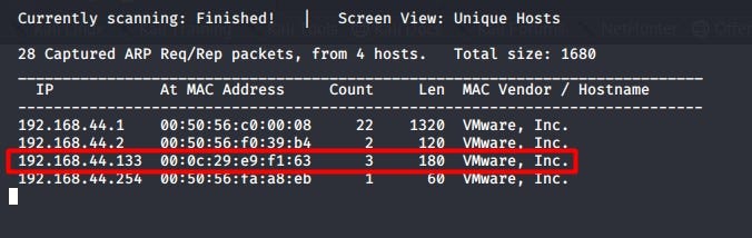 So first to go through to find the IP of the target system I started with Netdiscover.