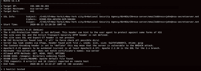 Running Nikto reveals that the hostname does not match the certificates name: