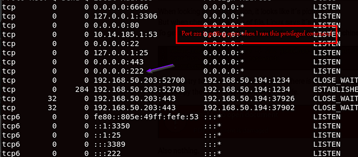 This user is allowed to play with systemctl to start ssh, i ran netstat to see what happens before and after I run that sudo command. The default port of SSH is not possible to use for some reason and I think it is whitelisted for specific IP addresses. lets look at the netstat outputs: