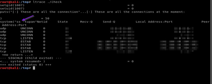 Running the file with ltrace. Looks like it is executing the “ss” command.