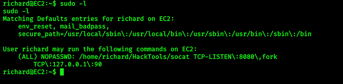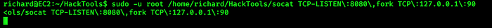 sudo -u root /home/richard/HackTools/socat TCP-LISTEN\:8080\,fork TCP\:127.0.0.1\:90