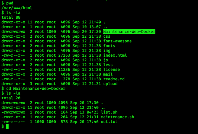 Great we got www-data shell i check almost every directory but i didn’t get anything useful, the i went to /var/www/html and found Maintenance-Web-Docker, and in that i found 3 files