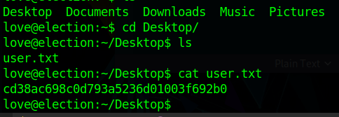 Now let me quickly cat out the user.txt contents