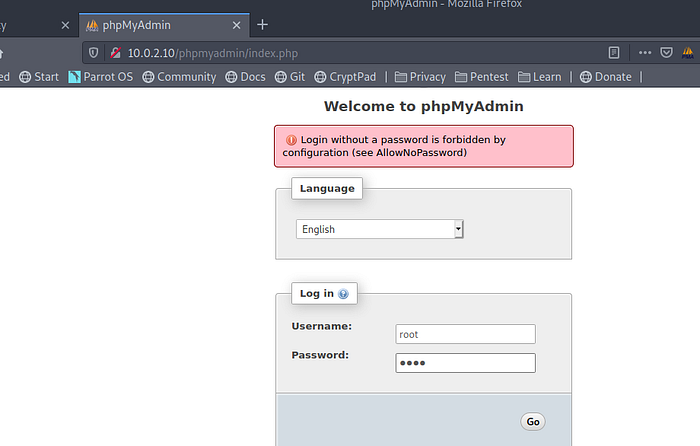 The phpmyadmin login page:-